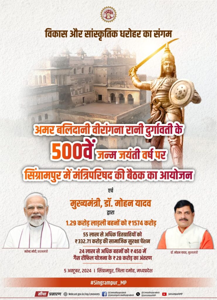 अमर बलिदानी वीरांगना रानी दुर्गावती जी के 500वें जन्म जयंती वर्ष पर उनके सम्मान में सिंग्रामपुर में मंत्रिपरिषद की बैठक का आयोजन। साथ ही –