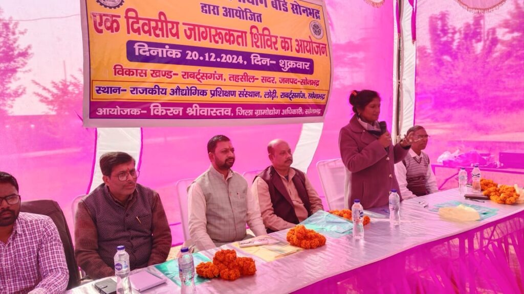 सोनभद्र / सोनभद्र दिनांक 20.12.2024 को उत्तर प्रदेश खादी तथा ग्रामोद्योग बोर्ड द्वारा संचालित रोजपरक योजनाएं के प्रचार प्रसार हेतु इक दिवसीय जागरूकता कार्यक्रम औद्योगिक प्रशिक्षण केंद्र लोढ़ी राबर्ट्सगंज सोनभद्र में आयोजित किया गया ।एक दिवसीय आयोजित जागरूकता कार्यक्रम में जिला ग्रामोद्योग अधिकारी श्रीमती किरन श्रीवास्तव द्वारा उपस्थित छात्र एवं छात्राओं को मुख्यमंत्री ग्रामोद्योग रोजगार योजना,मुख्यमंत्री माटीकला रोजगार योजना, के फोल्डर वितरण कराते हुए शहर की और पलायन को रोकने हेतु ग्रामीण अंचल में कुटीर उद्योगों की स्थापना हेतु