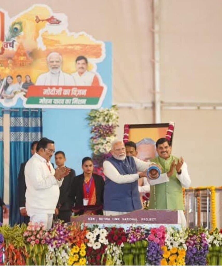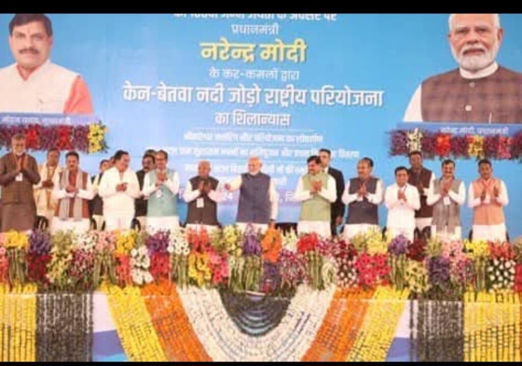 माननीय प्रधानमंत्री श्री नरेंद्र मोदी जी ने आज खजुराहो से देश की पहली केन-बेतवा नदी जोड़ों परियोजना का शिलान्यास तथा ओंकारेश्वर फ्लोटिंग सौर परियोजना का लोकार्पण एवं 1153 अटल ग्राम सुशासन भवनों का भूमिपूजन कर मध्यप्रदेश को एतिहासिक सौगातें प्रदान की है।