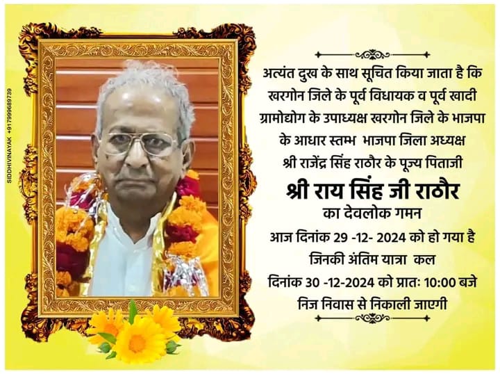जिनकी अंतिम यात्रा 30 दिसंबर 2024, सोमवार को प्रातः 10:00 निज निवास से निकाली जाएगी। परमपिता परमेश्वर दिवंगत आत्मा को श्रीचरणों में स्थान प्रदान कर शोकाकुल परिजन को दुःख सहने की शक्ति दें।