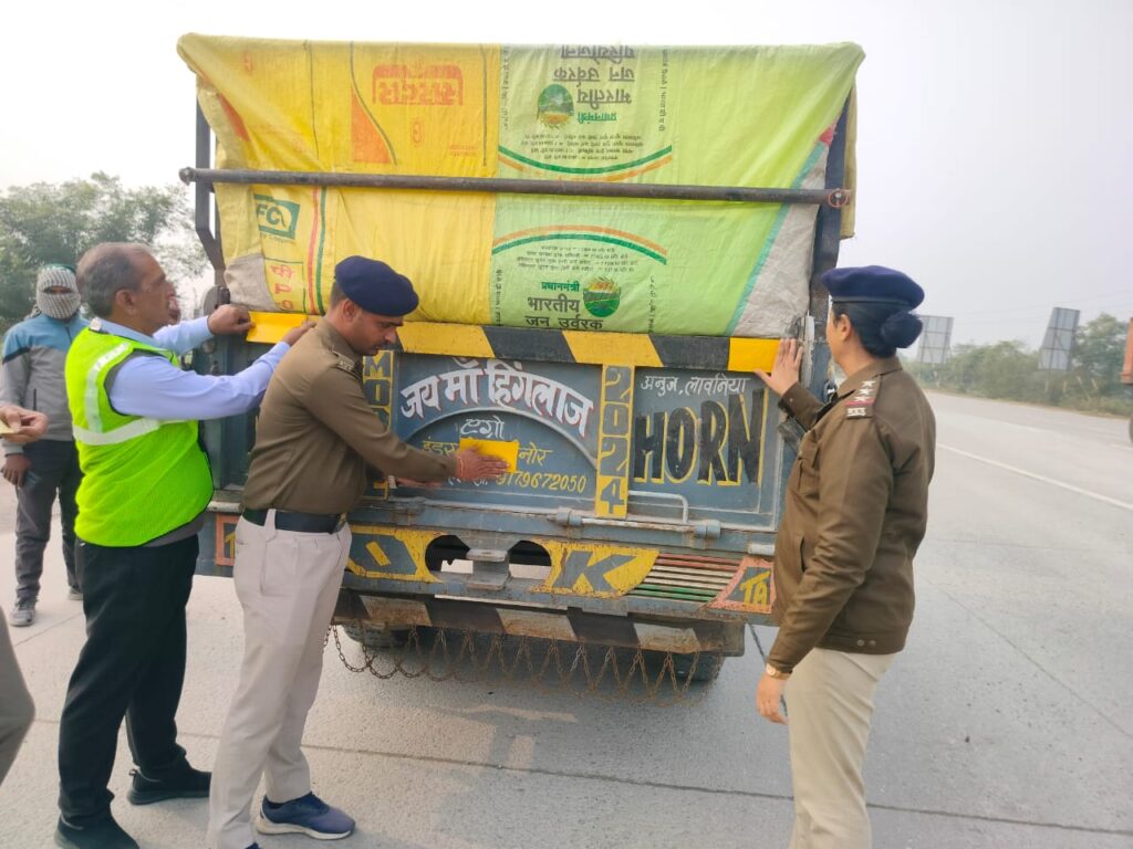 ग्वालियर 12.01.2025 । दिनांक 01.01.2025 से 31.01.2025 तक राष्ट्रीय सड़क सुरक्षा माह का आयोजन चलाया जा रहा है। इसी के अनुक्रम में ग्वालियर पुलिस द्वारा विभिन्न थाना क्षेत्रों में कार्यक्रम आयोजित कर वाहन चालाकों को यातायात नियमों के प्रति जागरूक किया जा रहा है और अभियान के दौरान वाहन चालकों को हेलमेट लगाने, सीट बेल्ट बांधने, शराब पीकर वाहन न चलाने, बिना ड्राइविंग लाइसेंस एवं बिना बीमा वाहन न चलाने जैसे नियमों के प्रति जागरूकता बढ़ाने का प्रयास किया जा रहा है तथा ट्रैक्टर-ट्राली, ट्रक, मिनी ट्रक आदि में पीछे की ओर रेडियम टेप लगाए जा रहे हैं।
