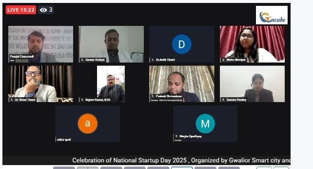 16 जनवरी 2025: राष्ट्रीय स्टार्टअप दिवस के अवसर पर ग्वालियर स्मार्ट सिटी द्वारा स्थापित किए गए जीइनक्यूब इनक्यूबेशन सेंटर द्वारा इस दिवस को मनाया गया, इस अवसर पर जीइनक्यूब द्वारा एक विशेष पैनल डिस्कशन का आयोजन किया गया इस कार्यक्रम का आयोजन ऑनलाइन माध्यम से किया गया इस कार्यक्रम का मुख्य उद्देश्य जीइनक्यूब द्वारा ग्वालियर और चम्बल क्षेत्र में स्टार्टअप इकोसिस्टम को विकसित करना था इस महत्त्वपूर्ण विषय पर चर्चा करने के लिए जीइनक्यूब द्वारा स्टार्टअप इकोसिस्टम के मुख्य स्तंभ माने जाने वाले मुख्य व्यक्तियों को आमंत्रित किया गया, जिस में स्टार्टअप मेंटर के रूप में नीति आयोग के क्षेत्रीय मेंटर डॉ. विनोद तिवारी, एमएसएमई के सहायक निदेशक श्री राजीव कुमार,MITS इन्क्यूबेशन सेल से डॉ. अंकित तिवारी, स्टार्टप इन्वेस्टर स्क्वेरअप कैपिटल के सीईओ श्री अंकुर गोयल, स्टार्टअप फाउंडर प्रिनोवेंट प्राइवेट लिमिटेड के श्री प्रतीक श्रीवास्तव, और वीएन ऑर्गेनिक्स की संस्थापक निशा निरंजन, स्टूडेंट स्टार्टअप टैरो एड्स की फाउंडर सचि पाण्डेय एवं जीइनक्यूब से डायरेक्टर गौरव शाक्या शामिल हुए इस कार्यक्रम को प्रांजल चतुर्वेदी एवं मेघा उपाध्याय ने संचालित किया|
