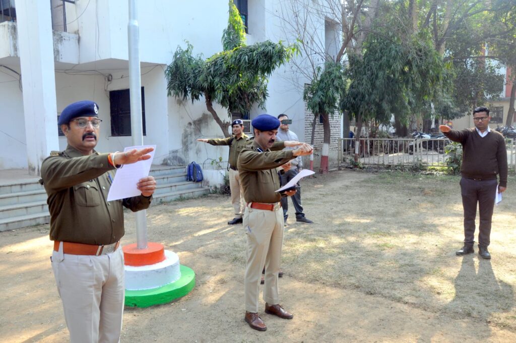 उक्त निर्देश के अनुक्रम में आज दिनांक 24 जनवरी 2025 दिन शुक्रवार को प्रातः 11.00 बजे पुलिस अधीक्षक कार्यालय ग्वालियर में “राष्ट्रीय मतदाता दिवस” के अवसर पर पुलिस अधीक्षक महोदय ग्वालियर श्री धर्मवीर सिंह(भापुसे) द्वारा कार्यालय के पुलिस अधिकारी और कर्मचारियों को राष्ट्रीय मतदाता दिवस” पर शपथ दिलाई गई। इस अवसर पर अति. पुलिस अधीक्षक ग्रामीण श्री निरंजन शर्मा एवं पुलिस के अधिकारी और कर्मचारीगण उपस्थित रहे।