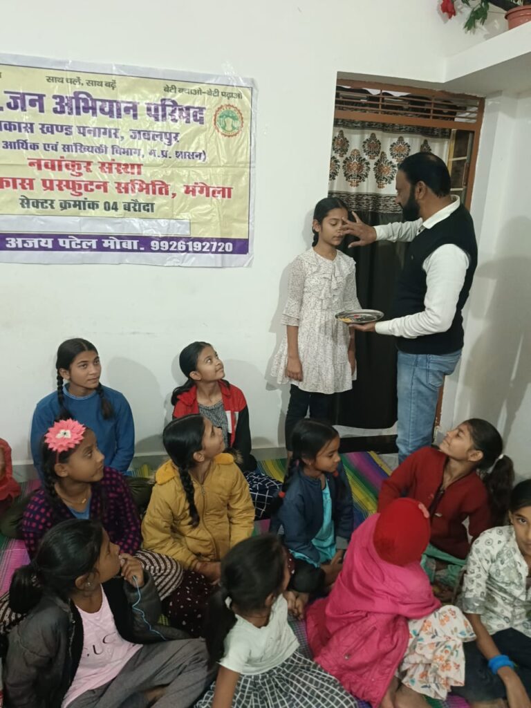 मध्य प्रदेश जन अभियान परिषद विकास खण्ड पनागर जबलपुर सेक्टर बरौदा नवांकुर संस्था अध्यक्ष अजय पटेल द्वारा जिला समन्वयक प्रदीप तिवारी जी,विकास खण्ड समन्वयक भारत महरौलिया के मार्गदर्शन में आज ,,राष्ट्रीय बालिका दिवस,, कार्यक्रम आयोजित किया गया। प्रत्येक वर्ष 24 जनवरी को ,,राष्ट्रीय बालिका दिवस,, मनाया जाता है, जिसका उद्देश्य लड़कियों के अधिकारों को बढ़ावा देना और उनके सशक्तिकरण को प्रोत्साहित करना है।लड़कियों की शिक्षा और स्वास्थ्य के महत्व पर जोर देना।लड़कियों के खिलाफ हिंसा और भेदभाव को रोकने के लिए कदम उठाना।लड़कियों को आत्मनिर्भर बनाने के लिए प्रशिक्षण के अवसर प्रदान किए जाना।समाज में लड़कियों के प्रति सकारात्मक दृष्टिकोण को बढ़ावा देना। बालिकाओं के अधिकारों और सुरक्षा के बारे में चर्चा की गई।जैसे कि बाल विवाह की रोकथाम, बालिकाओं की शिक्षा और स्वास्थ्य सुविधाओं पर ध्यान देना। कार्यक्रम में नवांकुर संस्था अध्यक्ष अजय पटेल, एम एस डब्लू, छात्रा आंशिका पटेल, बी एस डब्लू, छात्रा मानसी पटेल,अमृता पटेल, लक्ष्मी पटेल, अंशु पटेल और अन्य बालिकाओं और समिति सदस्यों की कार्यक्रम में उपस्थिति रही।