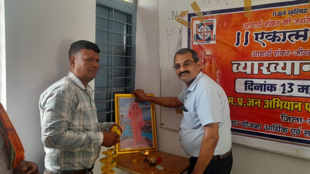 स्यावानी टीकमगढ़ :पलेरा – मध्य प्रदेश जन अभियान परिषद विकासखंड पलेरा द्वारा आदि गुरु शंकराचार्य जी की जयंती के उपलक्ष्य में शासकीय महाविद्यालय पलेरा में व्याख्यान माला कार्यक्रम आयोजित किया गया। कार्यक्रम के पधारे मुख्य अतिथि पं राजेश जी नायक अध्यक्ष सर्व ब्राह्मण समाज पलेरा के मंडल अध्यक्ष पवन कुमार संज्ञा एवं अतिथि शासकीय महाविद्यालय पलेरा के प्राचार्य श्री एम एल प्रजापति जनपद सदस्य सुनील रजक एवं अनुसूचित जाति के जिला अध्यक्ष मुकेश अहिरवार द्वारा कार्यक्रम की शुरुआत शंकराचार्य जी के चित्र पर माल्यार्पण एवं दीप प्रज्वलित कर की गई इसके बाद अतिथियों का स्वागत कर विकासखंड समन्वयक राजकुमार जैन द्वारा आदि गुरु शंकराचार्य जी जयंती पर आयोजित कार्यक्रम की रूपरेखा एवं उद्देश्य के बारे में विस्तार से बताते हुए कहा कि परिषद द्वारा संपूर्ण मध्य प्रदेश में 2 मई से 16 मई तक आदि गुरु शंकराचार्य जयंती पखवाड़ा के रूप में मनाया जा रहा है इसी के तहत पलेरा में कार्यक्रम आयोजित किया गया है इसके बाद कार्यक्रम में पधारे मुख्य वक्ता राजेश नायक द्वारा आदि गुरु शंकराचार्य जी की जीवन पर प्रकाश डालते हुए कहा की शंकराचार्य जी ने 8 वर्ष की उम्र में ही समस्त वेद एवं पुराण और उपनिषद को कंठस्थ कर मात्र 16 वर्ष की उम्र में उन्होंने ब्रह्म ज्ञान प्राप्त कर पैदल भ्रमण कर भारत के चार दिशाओं में चार मठ की स्थापना की थी उन्होंने भारत देश को एकता और अखंडता के सूत्र में बांधकर भारत में सनातन धर्म की पुर्नस्थापना की इसके बाद कार्यक्रम में पधारे मुख्य अतिथि श्री पवन संज्ञा जी मंडल अध्यक्ष ने कहा कि शंकराचार्य जी ने संपूर्ण भारत में सनातन धर्म की पताका फहराई एवं भारत में चार मठ की स्थापना कर भारत को पूर्व से पश्चिम एवं उत्तर से दक्षिण तक एकता के सूत्र में पिरोया । उन्होंने जन अभियान परिषद द्वारा आयोजित कार्यक्रम की सराहना करते हुए धन्यवाद ज्ञापित किया और कहा कि इस प्रकार के कार्यक्रम भविष्य में भी होते रहना चाहिए जिससे लोगों को शंकराचार्य जी के जीवन के बारे में अधिक से अधिक जानने का मौका मिले कार्यक्रम में मंच का संचालन मध्य प्रदेश जन अभियान परिषद के ब्लॉक समन्वयक में राजकुमार जैन द्वारा किया गया, कार्यक्रम मे नवांकुर संस्था के सदस्य राघवेंद्र सिंह आदि गुरु शंकराचार्य जी के आदर्शों पर चलना के बारे में बताया एवं हरपाल सिंह रघुवीर सिंह राजपूत हृदेश सेन,मेंटर भूपेंद्र सिंह मुकेश कुमार अहिरवार सभी अतिथियों का आभार व्यक्त कियागजेश सेन अरविंद सिंह सीमा अहिरवार,प्रस्फुटन समिति के सदस्य जनपद सदस्य सुनील रजक दशरथ रजक सरपंच ग्राम पंचायत गोंना ,सीएमसीएलडीपी छात्र-छात्राओं सहित बड़ी संख्या में लोग उप