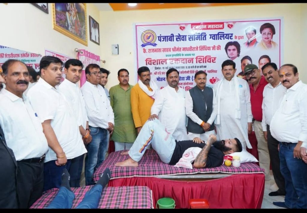 .ग्वालियर: राजमाता माधवी राजे सिंधिया की प्रथम पुण्यतिथि के अवसर पर पंजाबी सेवा समिति द्वारा हिमांशु खत्री v शिल्पा खत्री के संयोजन में रक्तदान शिविर का आयोजन किया गया . इस शिविर में 42 लोगों ने रक्तदान कर राजमाता को अपनी श्रद्धांजलि अर्पित की