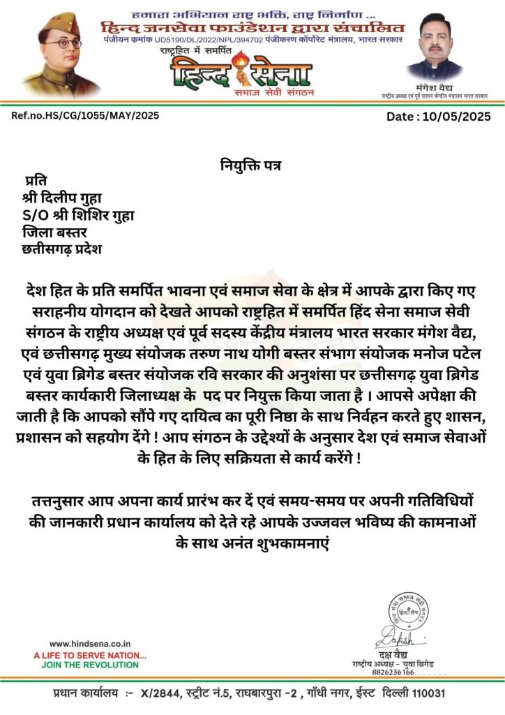हिन्द सेना मे दिलीप गुहा को युवा ब्रिगेड बस्तर कार्यकारी जिलाध्यक्ष की मिली कमान,पदाधिकारी व कार्यकर्ताओं ने दी बधाई