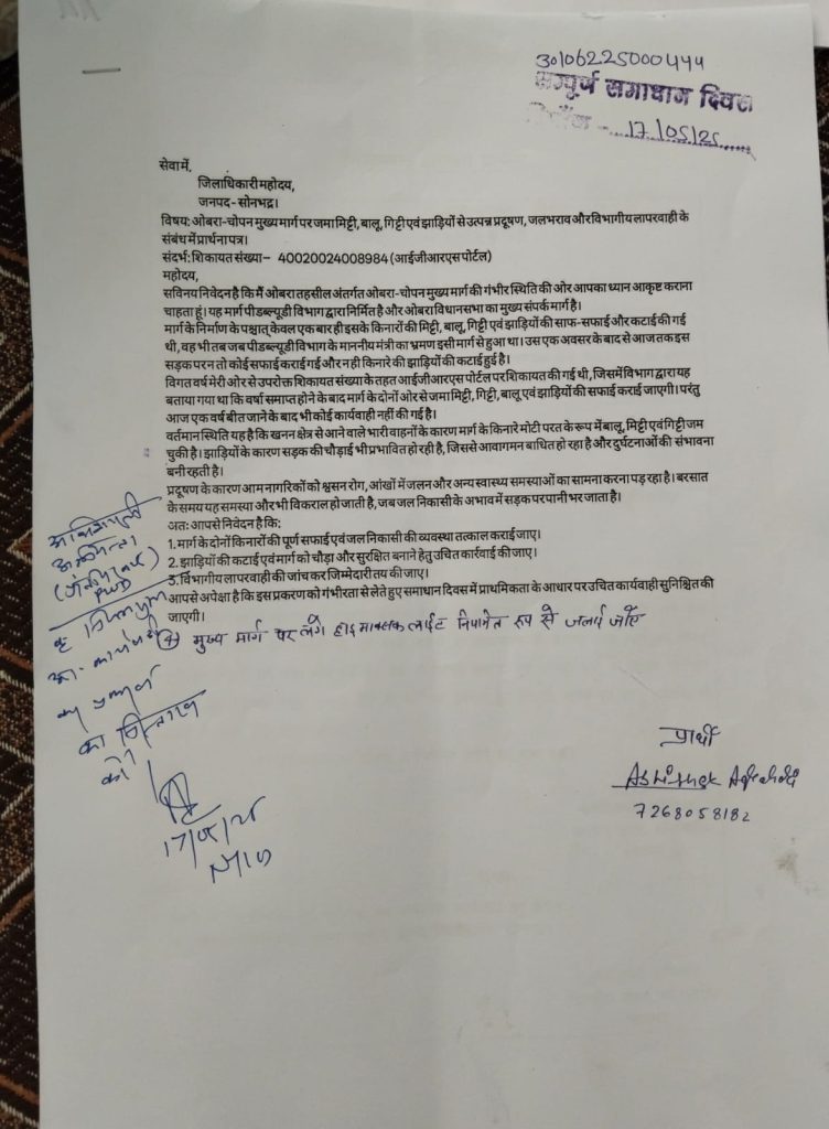 *सोनभद्र ओबरा* छात्र नेता छात्र नेता अभिषेक अग्रहरी ने अपने दिए हुए शिकायती पत्र के माध्यम से माग किया है कि सड़क के दोनों किनारे एकत्रित धूल, मिट्टी, गिट्टी के साथ बड़े-बड़े झाड़ियो ने सड़क की चौड़ाई को कम कर दिया है साथ ही मार्ग पर लगे हाई मास्क लाइट सिर्फ शो पीस जैसे हो गए हैं जिस संदर्भ में प्रार्थी द्वारा पूर्व में आइजीआरएस पोर्टल पर शिकायत दर्ज कराई गई थी लेकिन शिकायत के समाधान में अधिकारी द्वारा यह बताया गया था कि बरसात के उपरांत रोड के किनारे एकत्रित धूल मिट्टी के कणों को हटवा लिया जाएगा लेकिन शिकायत के 1 वर्ष बाद भी इस पर कोई कार्रवाई नहीं हुआ जिस कारण बरसात होने के बाद सड़क पर जल भराव हो जाता है जिससे आवागमन में भी काफी असुविधा होता है इस संदर्भ में उचित कार्रवाई की मांग करते हुए यह शिकायत पत्र दिया गया।