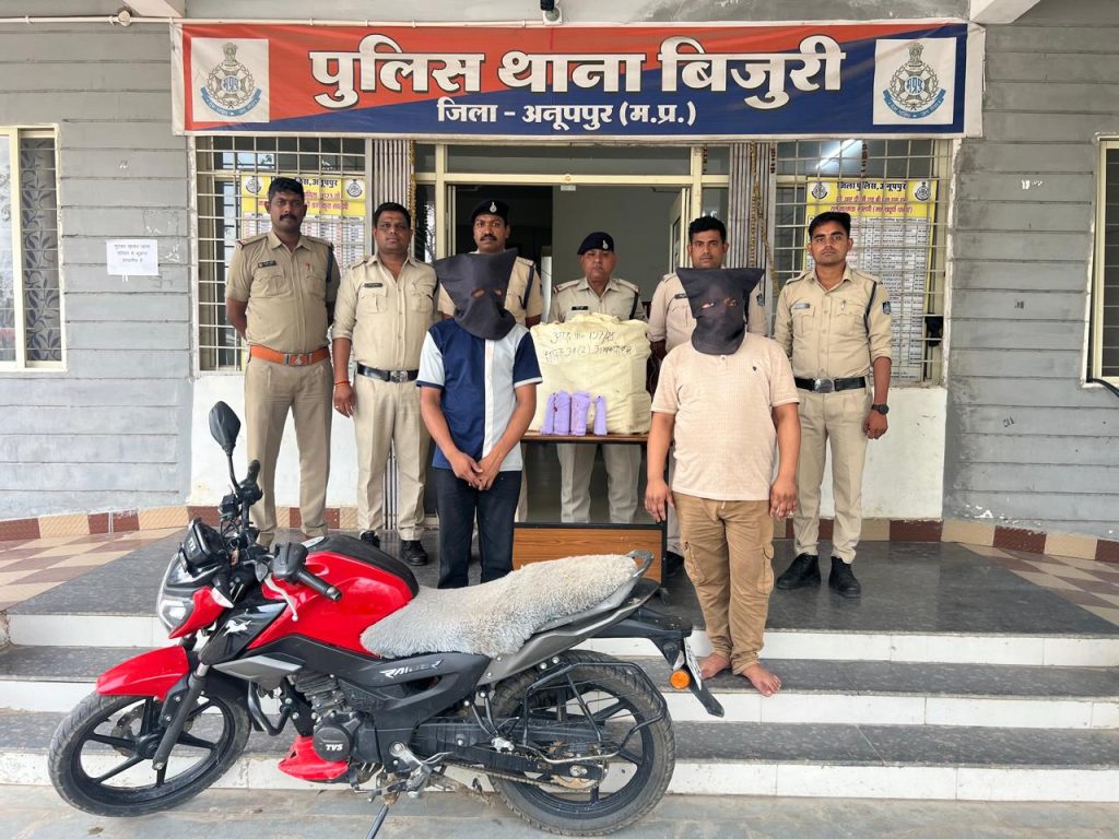घटना विवरणः- पुलिस अधीक्षक अनूपपुर मोती उर्र रहमान जी के द्वारा अवैद्य गतिविधियों एवं अवैद्य कारोबार करने वालो पर कडी कार्यवाही हेतु आदेशित किया गया है जिसके अनुपालन मे अतिरिक्त पुलिस अधीक्षक अनूपपुर मो. इसरार मंसूरी एवं एस.डी.ओ.पी. कोतमा श्रीमति आरती शाक्य के कुशल मार्गदर्शन मे थाना बिजुरी पुलिस द्वारा दिनांक 22.05.25 को मुखबिर द्वारा प्राप्त सूचना प्राप्त होने पर कि एक व्यक्ति अपने टीव्हीएस राईडर मोटर साइकल क्र एमपी 65 जेडबी 4159 के पीछे बोरे मे बधे अवैद्य शराब को कोतमा से बिजुरी की तरफ बिक्री के उद्देश्य से ले जा रहा है सूचना पर बिजुरी पुलिस द्वारा एनएच 43 ढावे मे पास बैहाटोला मे रेड की कार्यवाही कर आरोपी दुर्गेश जायसवाल पिता चिन्ता जायसवाल उम्र 19 वर्ष निवासी रेउसा थाना कोतमा को रुकवाकर चेक किया जिसके पास से एक बोरी मे बीयर एवं व्लू चीफ अंग्रेजी शराब कुल 66 लीटर अवैद्य शराब एवं एक टीव्हीएस राईडर मोटर साइकल क्र एमपी 65 जेडबी 4159 कुल मशरुका 83.520 रुपये का विधिवत जप्त कर आरोपी के विरुद्ध अप. क्र 157/25 धारा 34(2) आब एक्ट का पंजीबद्ध किया गया तथा पूछताछ की गयी जिसमे आरोपी द्वारा शराब के मुख्य व्यापारी रामचरित्र जायसवाल पिता रामचरण जायसवाल उम्र 30 वर्ष निवासी रेउसा के बारे मे बताया जो उक्त अपराध का मुख्य आरोपी होने से दोनो आरोपियों को विधिवत गिरफ्तार किया जाकर माननीय न्यायालय पेश किया गया है।