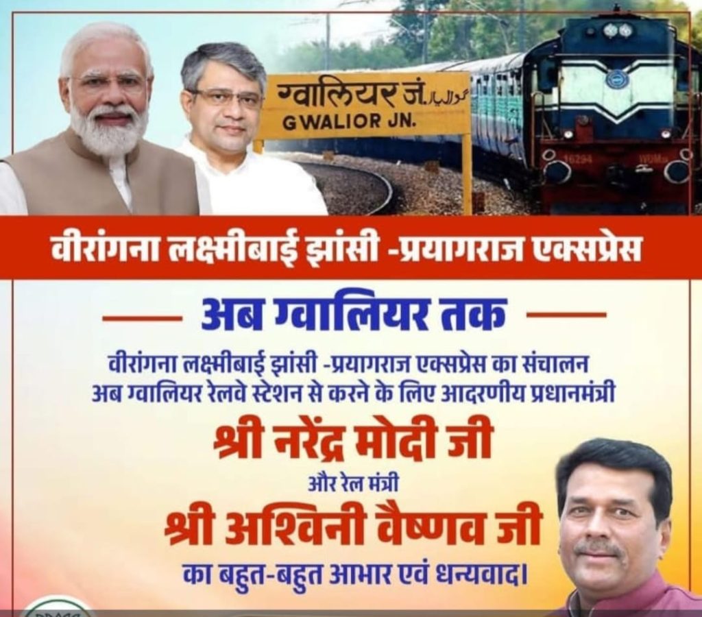ग्वालियर: वीरांगना लक्ष्मी बाई प्रयागराज एक्स्प्रेस का संचालन ग्वालियर से करने के लिए सांसद श्री कुशवाहा ने आदरणीय प्रधानमंत्री श्री नरेंद्र मोदी और रैल मंत्री श्री अश्विनी vaishnav जी का आभार माना