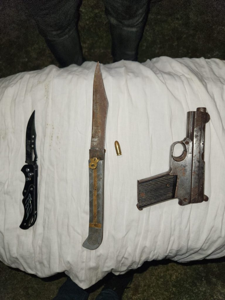 1 पिस्टल, 1 कारतूस बटनदार चाकू, 1 चाकू एवं 2 तलवार जप्त
