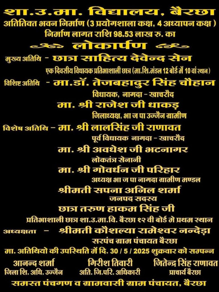 लोकार्पण कार्यक्रम में विशेष अतिथि पूर्व विधायक लालसिंह राणावत, स्वतन्त्रता सेनानी अवधेश भटनागर, भाजपा नागदा ग्रामीण मंडल अध्यक्ष गोवर्धन परिहार, जनपद सदस्य श्रीमती सपना अनिल शर्मा, प्राचार्य शा.उ.मा.वि.बेरछा जितेन्द्रसिंह राणावत रहे एवं अध्यक्षता श्रीमती कौशल्यादेवी रामेश्वर नंदेड़ा सरपंच ग्राम पंचायत बेरछा ने की।