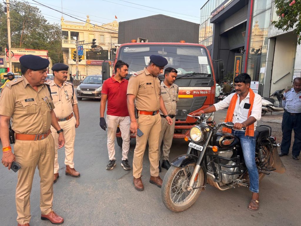 // यातायात पुलिस द्वारा काली फिल्म व मॉडिफाई साइलेंस , अमानक नंबर प्लेट लगाकर चलने वालों के विरुद्ध की चलानी एवं नगर निगम मदाखलत दस्ते के साथ मिलकर अवैध अतिक्रमण करने वालों के विरुद्ध की संयुक्त कार्यवाही कार्यवाही//