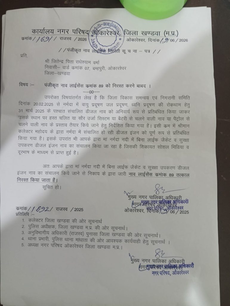 अभी-अभी तीर्थनगरी ओंकारेश्वर से आ रही है बड़ी खबर जिला कलेक्टर खंडवा के आदेशों के बाद भी नर्मदा नदी में प्रतिबंधित इंजन का नाव मैं संचालन इस्तेमाल किए जाने के मामले में ओंकारेश्वर नगर परिषद की बड़ी कार्रवाई सोशल मीडिया एवं अन्य सूत्रों से प्राप्त जानकारी पर कार्रवाई करते नोका लाइसेंस क्रमांक 89 का लाइसेंस निरस्त किए जाने की बात नगर परिषद मुख्य कार्यपालन अधिकारी श्री संजय गीते ने देते हुए बतलाया कि जितेंद्र पिता राधेश्याम वर्मा निवासी ब्रह्पुरी वार्ड क्रमांक 7 ओंकारेश्वर पर यह कार्रवाई की गई है जितेंद्र के विरुद्ध यह मामला दर्ज किया जाकर उसे नगर परिषद के द्वारा नोटिस भी सोपा गया संजय गीते जी के ने बताया कि उक्त प्रकरण से कलेक्टर पुलिस अधीक्षक एस डी एम एवं थाना प्रभारी मांधाता को भी सूचना भेज दी गई है बता दे की अभी भी कुछ नो का ओ का संचालन करने वाले कावेरी संगम के बाद प्रतिबंध इंजन का उपयोग कर रहे हैं वहीं यात्रियों को बचाव के लिए संसाधन भी उपलब्ध नहीं करवाए जा रहे हैं नगर परिषद की बड़ी कार्यवाही पर नर्मदा नदी में नौका संचालन करने वालों पर सन्नाटा छाया हुआ है जिसकी सर्वत्र चर्चा की जा रही है मुकेश शुक्ला आज तक 24 * 7