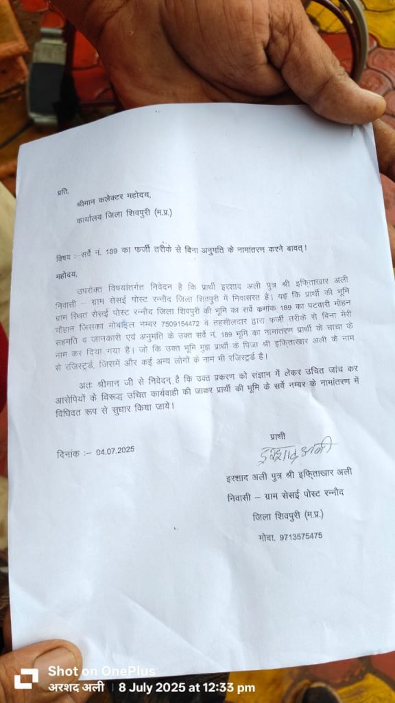शिवपुरी जिले रन्नौद पोस्ट के अंतर्गत आने वाले ग्राम सेसई गांव के रहने वाले इरशाद अली पुत्र श्री इफ्िताखार अली ने जानकारी देते हुए बताया की गांव में उसके पिता के नाम सर्वे नंबर 189 की जमीन दर्ज थी। जिसे उसके चाचा ने पटवारी तहसीलदार से मिलकर फर्जी तरीके से अपने नाम करा ली। जिसकी शिकायत उसने आज मंगलवार की दोपहर 12 बजे शिवपुरी कलेक्टर से करते हुए, कार्यवाही की गुहार लगाई है।