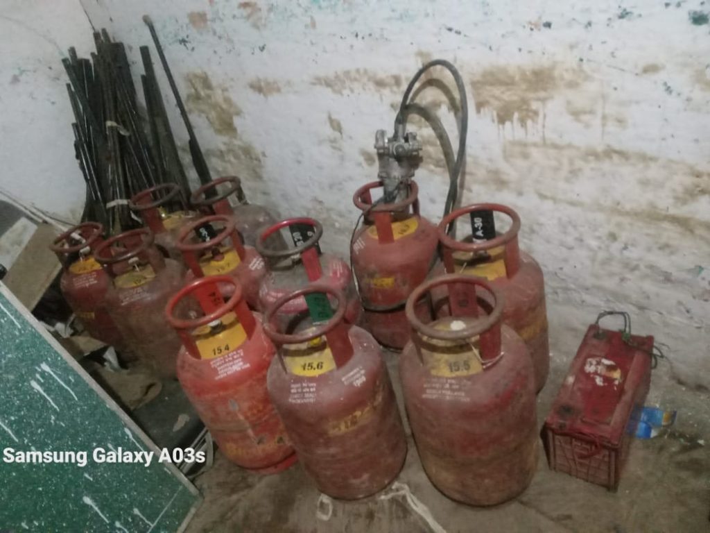 *11 घरेलू गैस सिलेण्डर, 1 गैस रिफलिंग मशीन, बैटरी जप्त*