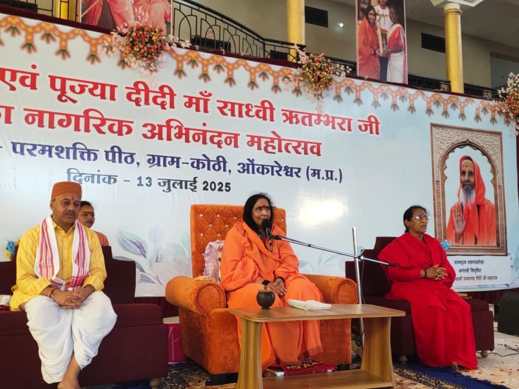 ओंकारेश्वर तीर्थ नगरी के निकट ग्राम शिव कोठी परम शक्ति पीठ के तत्वाधान में दीदी मां का महोत्सव श्रद्धा एवं हर्षोल्लास के साथ मनाया गया। इस अवसर पर दीदी मां ने गुरु की महिमा पर प्रकाश डालते हुए अत्यंत प्रभावी उद्बोधन दिया। दीदी मां ने कहा कि किसी साधक को सतगुरु का मिलना अत्यंत सौभाग्य की बात है। गुरु अनुशासन की छेनी से शिष्य को गढ़ता है। दीदी मां ने कहा कि जब रचनात्मक विचार व्यवहार में बदलते हैं तो परिवर्तन आता है। हमें प्रत्येक भारतवासी के चेहरे पर मुस्कान लाने के लिए समर्पण एवं निष्ठा के साथ प्रयास करना होंगे। दीदी मां ने भक्तों के समक्ष अपने गुरु परमानंद जी महाराज की कृपा और रामजन्म भूमि आंदोलन से जुड़े संस्मरण साझा किए। दीदी मां ने बताया कि उन्होंने 16 वर्ष की आयु में बिना किसी को बताए घर छोड़ा था। मन में वैराग्य का भाव लिए मैं बस में बैठ गई और रुड़की होते हुए हरिद्वार पहुंची।तत्पश्चात अमृतसर के एक आश्रम में सत्संग के दौरान मुझे अपने महान गुरु का साक्षात्कार हुआ। आश्रम में अनेक दैदीप्यमान महापुरुष मौजूद थे। उनके बीच मेरे गुरुदेव बैठे थे। मैंने देखते ही गुरुदेव के चरणों में माथा टेका और फिर उनके चरणों से मेरा माथा नहीं उठा। गुरुदेव ने मेरे माथे को स्पर्श किया और मैं भावसमाधि के ध्यान की गहराइयों में उतर गई। गुरुदेव ने मुझे संन्यास की दीक्षा दी और ऋतंभरा नाम दिया। गुरुदेव के रूप में ईश्वर मुझे मिले। दीदी मां ने कहा कि बालिकाएं उच्छृंखल नहीं बनें। रील बनाकर अपने चरित्र का पतन नहीं करें और इजरायल की वीर नारियों की तरह वीरबाला बनें। दीदी मां की ओजस्वी वाणी सुनकर नौजवान जागे और अयोध्या में राम मंदिर के निर्माण का मार्ग प्रशस्त हुआ। महोत्सव के प्रारंभ में परमशक्ति पीठ की नन्हीं बालिकाओं ने राष्ट्रप्रेम से ओतप्रोत सांस्कृतिक कार्यक्रमों की प्रभावशाली प्रस्तुति दी।परमशक्ति पीठ की संचालिका साध्वी साक्षी चेतना दीदी,विधायक राजकुमार मेव, भाजपा जिलाध्यक्ष नंदा ब्राह्मणे, विधायक कंचन तन्वे, विधायक सचिन बिरला,विधायक नारायण पटेल,अनद केनाडकर, डायल 100 के नाम से विख्यात संटू दादा पुनासा सहित बड़ी संख्या में आसपास एवं दूरस्थ प्रदेशों के श्रद्धालु बड़ी संख्या में उपस्थित थे।