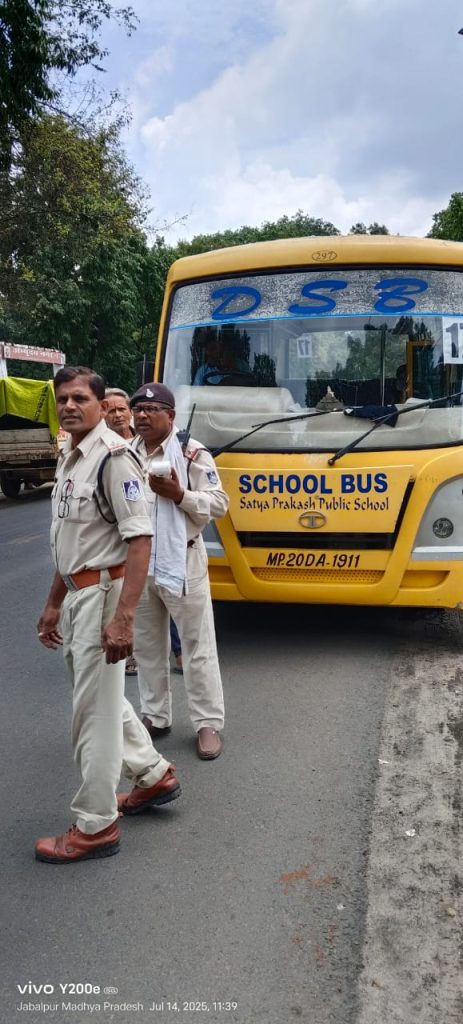 छात्र-छात्राओं की सुरक्षा, सड़क दुर्घटनओं में कमी लाये जाने एवं शहर की याातायात व्यवस्था सुचारू रूप संचालन के उद्देश्य से पुलिस अधीक्षक जबलपुर श्री सम्पत उपाध्याय (भा.पु.से) के आदेशानुसार, अतिरिक्त पुलिस अधीक्षक यातायात श्रीमति पल्लवी शुक्ला के निर्देशन में एवं उप पुलिस अधीक्षक यातायात श्री संतोष शुक्ला, श्रीमति संगीता डामोर के मार्गदर्शन में थाना प्रभारी यातायात घमापुर श्रीमति इंद्रा ठाकुर, थाना प्रभारी यातायात गढ़ा श्री हरिकिशन आटनेरे के द्वारा अपने-अपने थाना क्षेत्र में संचालित स्कूली वाहनों की चैंकिग की जा रही है।