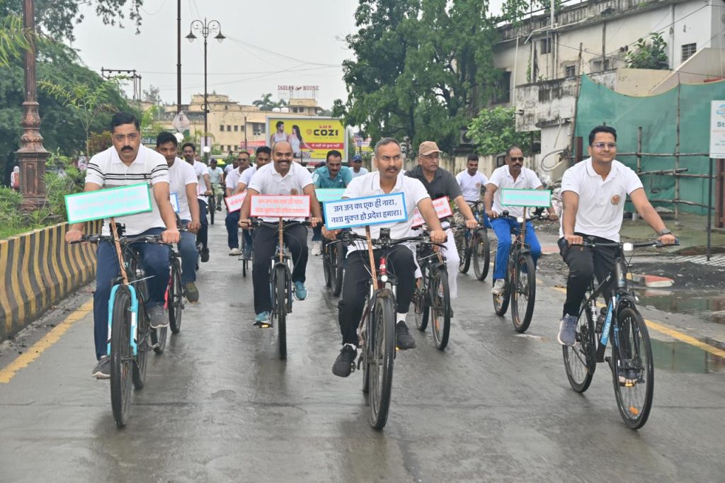’‘ नशे से दूरी, है जरूरी’’ पंद्रह दिवसीय नशा मुक्ति अभियान अंतर्गत पुलिस अधीक्षक जबलपुर श्री सम्पत उपाध्याय के नेतृत्व में अतिरिक्त पुलिस अधीक्षक शहर श्री आनंद कलादगी (भा.पु.से.), अतिरिक्त पुलिस अधीक्षक (ग्रामीण) श्री सूर्यकांत शर्मा, समस्त नगर पुलिस अधीक्षको सहित लगभग 70 अधिकारियेां/कर्मचारियों द्वारा सायकिल रैली निकालते हुये ‘‘हमारा है यही संदेश नशा मुक्त हो मध्य प्रदेश’’ के नारे लगाते हुये जागरूक किया गया।