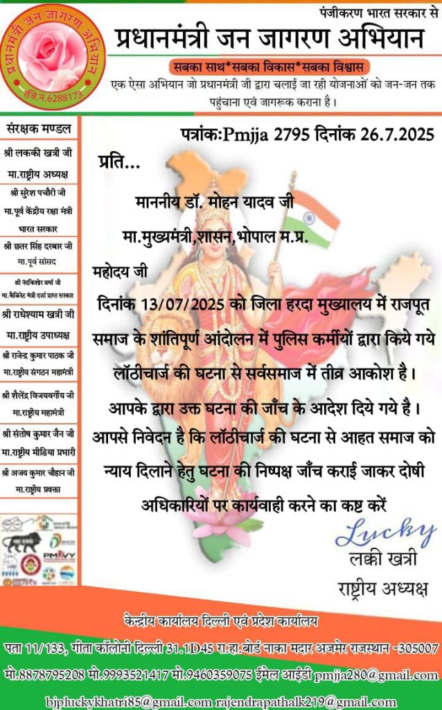 हरदा जिला मुख्यालय पर राजपूत समाज द्वारा शांतिपूर्ण रूप से अपने संवैधानिक अधिकारों के तहत किए जा रहे आंदोलन पर जिस प्रकार पुलिस द्वारा बल प्रयोग करते हुए लाठीचार्ज किया गया, वह अत्यंत दुखद, दुर्भाग्यपूर्ण और लोकतांत्रिक मूल्यों के विरुद्ध है।
