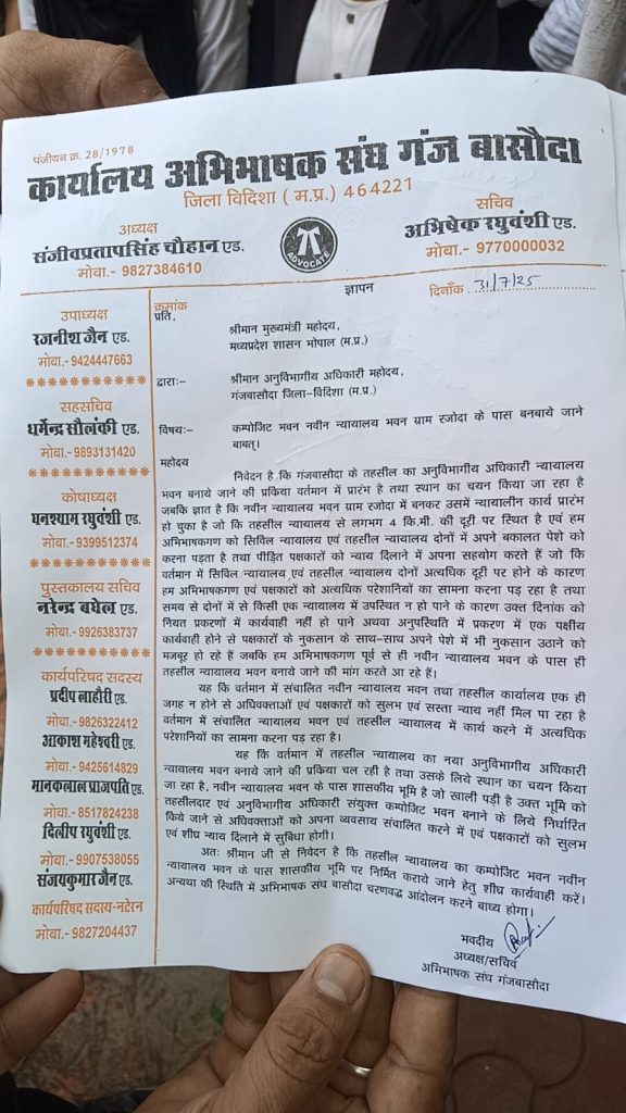 एंकर – गंजबासौदा के तहसील का अनुविभागीय अधिकारी न्यायालय भवन बनाये जाने की प्रकिया वर्तमान में प्रारंभ है तथा स्थान का चयन किया जा रहा है जबकि ज्ञात है कि नवीन न्यायालय भवन ग्राम रजोदा में बनकर उसमें न्यायालीन कार्य प्रारंभ हो चुका है जो कि तहसील न्यायालय से लगभग 4 कि.मी. की दूरी पर स्थित है एवं हम अभिभाषकगण को सिविल न्यायालय एवं तहसील न्यायालय दोनों में अपने बकालत पेशे को करना पड़ता है तथा पीड़ित पक्षकारों को न्याय दिलाने में अपना सहयोग करते हैं जो कि वर्तमान में सिविल न्यायालय एवं तहसील न्यायालय दोनों अत्यधिक दूरी पर होने के कारण हम अभिभाषकगण एवं पक्षकारों को अत्यधिक परेशानियों का सामना करना पड़ रहा है तथा समय से दोनों में से किसी एक न्यायालय में उपस्थित न हो पाने के कारण उक्त दिनांक को नियत प्रकरणों में कार्यवाही नहीं हो पाने अथवा अनुपस्थिति में प्रकरण में एक पक्षीय कार्यवाही होने से पक्षकारों के नुकसान के साथ-साथ अपने पेशे में भी नुकसान उठाने को मजबूर हो रहे हैं जबकि हम अभिभाषकगण पूर्व से ही नवीन न्यायालय भवन के पास ही तहसील न्यायालय भवन बनाये जाने की मांग करते आ रहे हैं।