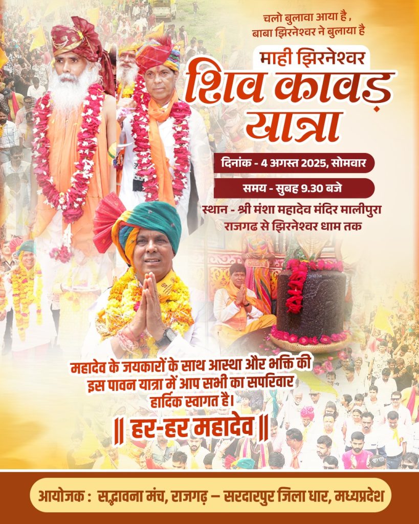 राजगढ़ — सद्भावना मंच राजगढ़ सरदारपुर द्वारा प्रतिवर्ष निकाली जाने वाली माही झिरणेश्वर शिव कावड़ यात्रा इस वर्ष 04अगस्त 2025 सोमवार को निकाली जाएगी। इस कावड यात्रा मे हजारो कि संख्या मे शिव भक्त होगे सम्मिलित। कावड़ यात्रा सुबह 9:00 बजे मंशा महादेव मंदिर मालीपुरा से प्रारंभ होकर राजगढ़ तथा सरदारपुर के प्रमुख मार्ग से होते हुए झिर्णेश्वर धाम पहुंचेगी जहां पर भगवान झिर्णेश्वर महादेव का अभिषेक कर महाप्रसादी वितरित कि जाएगी तथा शिव भक्तो को अभिमंत्रित रूद्राक्ष वितरित भी किए जाएंगे। इस कार्यक्रम का आयोजक सद्भावना मंच राजगढ़- सरदारपुर द्वारा किया जाएगा।