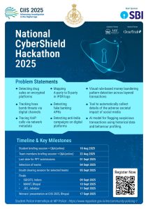 मध्य प्रदेश पुलिस द्वारा ‘‘साइबर इन्वेस्टीगेशन एंड इंटेलिजेंस समिट’’ का आयोजन भोपाल में किया जाना है जिसमें नेशनल साइबर शील्ड हेकेथन 2025 प्रतियोगिता का आयोजन भी किया गया है जिस हेतु प्रॉब्लम स्टेटमेंट दिए गये है जिनके सॉलूशन प्रतिभागियों को प्रेजेंट करना हैं ।