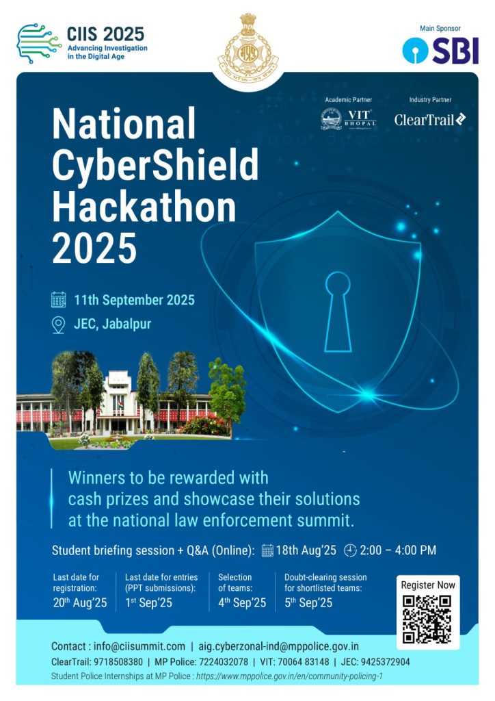 *मध्य प्रदेश पुलिस द्वारा ‘‘साइबर इन्वेस्टीगेशन एंड इंटेलिजेंस समिट’’ अंतर्गत आयोजित होने वाली प्रतियोगिता नेशनल साइबर शील्ड हेकेथन 2025 हेतु इंजिनियरिंग कालेज जबलपुर में 11 सितम्बर 2025 को आयोजित होने वाली प्रतियोगिता की रजिस्ट्रेशन कराने की अंतिम तिथि है 22 अगस् ,*