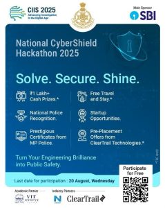 नेशनल साइबर शील्ड हैकथॉन 2025 में भाग लेने हेतु रजिस्ट्रेशन कराने की अंतिम तिथि 22 अगस्त हैं। जबलपुर इंजीनियरिंग कालेज में दिनॉक 11 सितम्बर 2025 को प्रतियोगिता आयोजित की जायेगी। किसी भी राज्य अथवा किसी भी जिले का कोई भी अम्यार्थी उक्त प्रतियोगिता में भाग ले सकता है।