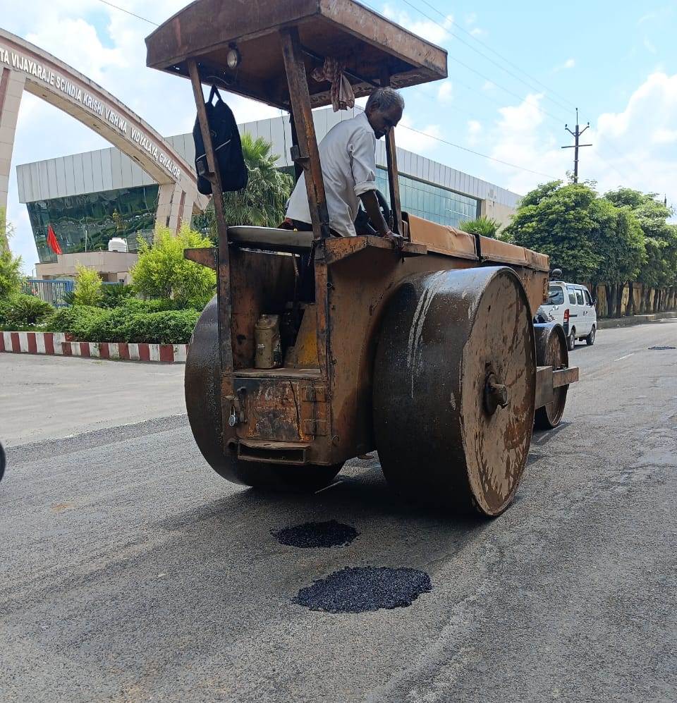 ग्वालियर दिनांक 08 सितंबर 2025- नगर निगम ग्वालियर द्वारा नागरिकों की सुविधा एवं सुगम यातायात के लिए अभियान चलाकर बरसात में खराब हुई शहर की गांरटी पीरियड की सड़कों पर ठेकेदार द्वारा एवं अन्य विभिन्न सड़कों पर नगर निगम द्वारा तेजी से पेंच रिपेयरिंग का कार्य किया जा रहा है।