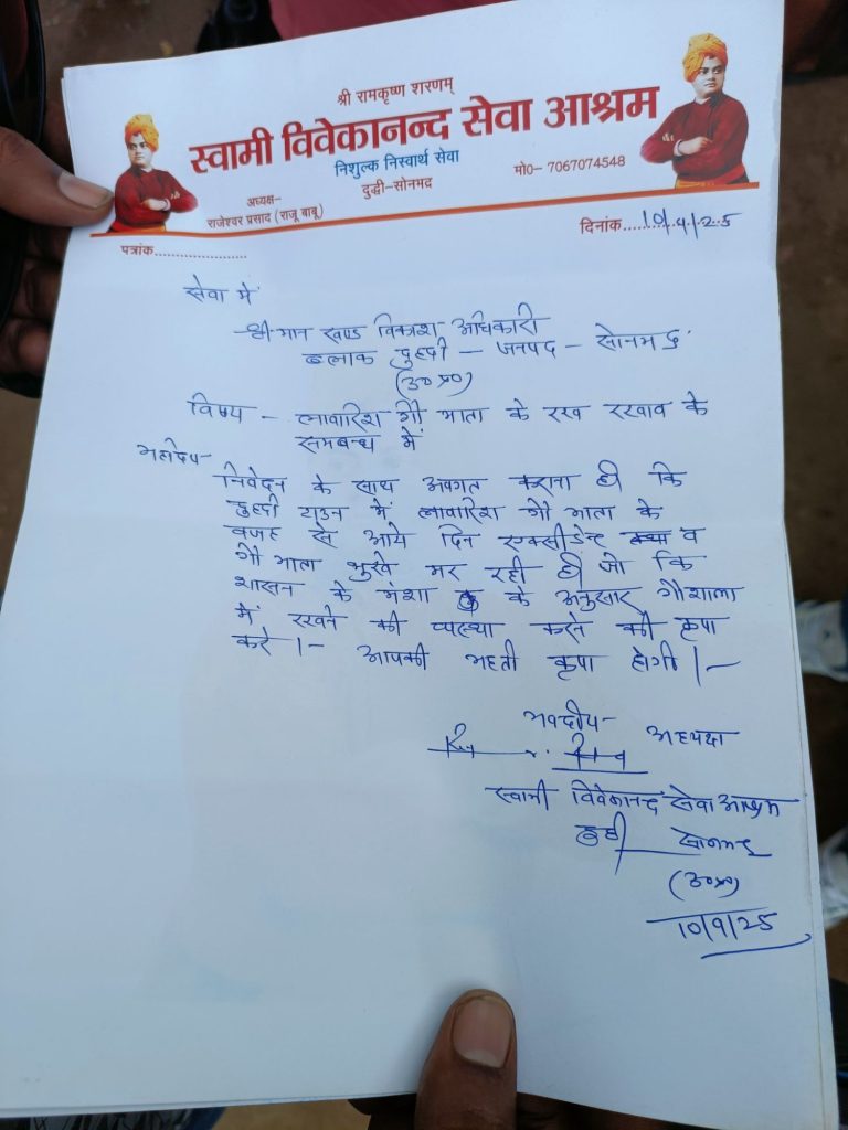 आज तक 24x7news सोनभद्र से विनोद कुमार की रिपोर्ट दुद्धी सोनभद्र। नगर पंचायत एवं आसपास के सड़कों पर अनभिज्ञ, अनबोलता गौ माता का एन एच 39 दुद्धी लुंबिनी मार्ग पर सड़कों पर घूमने के कारण जहां एक ओर आम राहगीर चोटिल होकर अपनी जान गवा चुके हैं वहीं कूड़े कचरे प्लास्टिक आदि का सेवन के कारण गौ माता को विभिन्न बीमारीयों का शिकार होना पड़ रहा हैं। जिससे मर्माहत स्वामी विवेकानंद सेवा आश्रम के राजेश्वर प्रसाद गुप्ता उर्फ राजू आढ़ती व साथ में स्वच्छता मिशन नगर पंचायत दुद्धी ब्रांड एंबेसडर जितेन्द्र कुमार चन्द्रवंशी ने खंड विकास अधिकारी दुद्धी श्री राम विशाल चौरसिया कों पत्रक सौंप कर उत्तर प्रदेश के मुख्यमंत्री योगी आदित्यनाथ के सराहनीय पहल पर ग्राम रजखड़ में निर्मित अत्याधुनिक सुविधाओं से परिपूर्ण गौशाला में चारा, दाना - पानी की उपलब्धता कराते हुए सड़कों पर घूम रहे गौ माता के संरक्षण रखरखाव की शासन के मंशा अनुरूप करते हुए सड़कों को छुट्टा घूम रहे गौ माता की सेवा के जाने की मांग किया है। खंड विकास अधिकारी के आस्वस्थ किया कि 1- 2 माह के भीतर पानी की उपलब्धता व हाई टेंशन तार के विद्युत विभाग के एसडीओ से हटायें जानें के उपरान्त शीघ्र ही गौशाला को सुचारू रूप से प्रारंभ कर दिया जाएगा। खंड विकास अधिकारी ने कहा कि सड़कों पर घूम रहे गौ माता को पशुपालक /स्वामी अपने यहां रखें अन्यथा विधिक कार्रवाई अमल में लाई जायेगी। खंड विकास अधिकारी ने बताया कि अब सड़कों पर घूम रहे गौ माता कों पालन हेतू ₹40 प्रतिदिन के हिसाब से चारा, दाना - पानी रख रखाव के लिए सरकार द्वारा सीधे खाते में प्रदान कराया जायेगा। जिस गौ माता को गौशाला में ले जाया जाएगा उन्हें इच्छुक अन्नदाता किसानों को निः शुल्क प्रदान कराया जाएगा। अब जल्द ही सड़कों पर घूम रहे गौ माता / पशुओं को गौशाला में भेजे जाने की कवायत तेज होगी साथ हीं सड़कों पर घूम रहे पशुपालकों के खिलाफ विधिक कार्रवाई लिखित में अमल में लाई जायेगी।