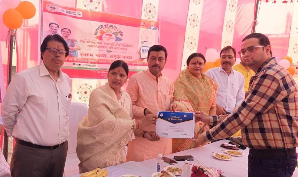 *औरैया 23 सितम्बर 2025-* आयुष्मान भारत प्रधानमंत्री जन आरोग्य योजना के 07 वर्ष पूरे होने पर जनपद स्तरीय कार्यक्रम सामुदायिक स्वास्थ्य केंद्र अजीतमल में मनाया गया। कार्यक्रम के मुख्य अतिथि सदर विधायका श्रीमती गुड़िया कठेरिया जी रही साथ ही जिला पंचायत सदस्य सोनू सेंगर जी, अध्यक्ष आशा चक की उपस्थिति में कार्यक्रम संपन्न कराया गया जिसमें पात्र लाभार्थियों के आयुष्मान कार्ड वितरण कराए गए साथ ही साथ योजना से लाभ प्राप्त लाभार्थियों ने अनुभव साझा किए ।योजना में अबद्ध चिकित्सालय जिन्होंने इस योजना के अंतर्गत सराहनीय कार्य किया है उन्हें प्रशस्ति पत्र विधायका गुड़िया कठेरिया के द्वारा प्रदान किया गया। प्रशस्ति पत्र प्राप्त करने वाले चिकित्सालियों में सरकारी चिकित्सालय सामुदायिक स्वास्थ्य केंद्र अजीतमल ,दिबियापुर,सहार , विधूना एवं जिला चिकित्सालय 100 शैय्या चिचौली,निजी चिकित्सालय में नयन ज्योति आई केयर सेंटर एवं गुलाब सिंह चिकित्सालय को दिया गया।