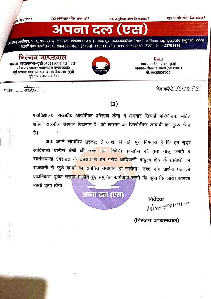 यह कदम इस बात का प्रमाण है कि अपना दल (एस) में कार्यकर्ताओं और पदाधिकारियों की आवाज़ को राष्ट्रीय स्तर पर सम्मान दिया जाता है और जनता की समस्याओं को प्राथमिकता के साथ सुना जाता है। दुद्धी विधानसभा क्षेत्र की जनता की ओर से मैं माननीय अनुप्रिया पटेल जी को हृदय से आभार प्रकट करता हूँ और साथ ही माननीय रेल मंत्री जी से विनम्र निवेदन करता हूँ कि इस जनहित समस्या का शीघ्र समाधान कर क्षेत्र की जनता को राहत पहुँचाएँ। समस्त जनमानस इस पहल के लिए आभारी रहेगा।