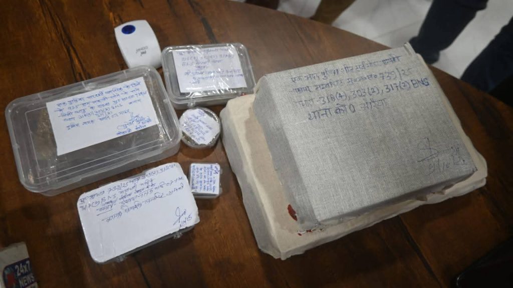 घटना का संक्षिप्त विवरण- दिनांक 09.10.25 को वादी सत्यजीत पुत्र स्वं हरिशंकर द्वारा तहरीर दी गई कि दिनांक 08.10.2025 को समय करीब 4 बजे वादी की खानपुर स्थित बैसनवी टुल्स नामक दुकान पर महिला सहित कुल सात लोग आये तथा बताया कि हमारे पास रेल से पाया हुआ करीब एक किलो सोना है जिसको हम आपको सस्ते रेटों में दे देगें, जिसके बाद वादी द्वारा सोने के दाने सुनार की दुकान पर जाकर चैक कराए गए तो वह पूरी तरह नकली निकले इस दौरान वादी की दुकान पर बैठे उक्त 7 अज्ञात लोगो द्वारा वादी का दो एम्प्लीफाइर/ कीपेड मोबाइल/पाँच हजार रूपये लेकर चले गए है जिसकी सूचना पर थाना कोतवाली औरैया पर मु0अ0सं0 739/2025 धारा 318(4),303(2), 317(2) बीएनएस पंजीकृत कर त्वरित कार्यवाही करते हुए कोतवाली औरैया पुलिस द्वारा मुखबीर की सूचना पर जालौन चौराहा से सांई मंदिर के पास से उक्त घटना से संबंधित 04 पुरूष+03 महिला अभि0गण- 1. दुखिया नायक 2. प्रताप सोधी 3. राजू 4. माइकल शिवा व 5. मीणा 6. सरसा 7. दुर्गा प्रधान को एक मोबाइल फोन कीपेड व दो अदद एम्प्लीफायर व 5000/- रुपए व नकली सोना के दाने बजनी करीब 925 ग्राम सहित गिरफ्तार कर अग्रिम विधिक कार्यवाही प्रचलित है।