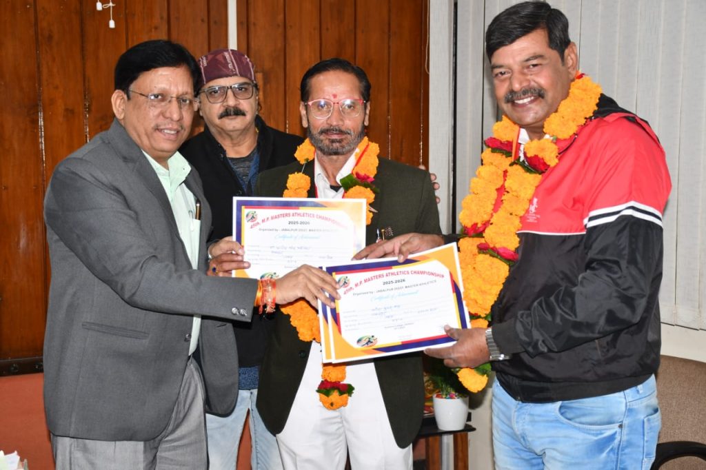 जबलपुर – एम.पी.मास्टर एथलेटिक्स चैपियनशिप का आयोजन जिला मास्टर एथलेटिक्स संघ द्वारा मॉडल सांइस कालेज मैदान में किया गया था इस प्रतियोगिता में रा.दु.वि.वि.मे सेवारत डांँ. संतोष सिंह भदौरिया ने तवा फेक प्रतियोगिता में 55+ आयु वर्ग मे प्रथम स्थान प्राप्त करते हुए गोल्ड मेडल जीता ही । वहीं मनोज कुमार सिंह ने 200 मीटर दौड़ मे 55+ आयु वर्ग मे प्रथम स्थान प्राप्त करते हुए गोल्ड मेडल जीता साथ ही गोला फेंक मे तृतीय स्थान प्राप्त करते हुए कांस्य पदक जीता । साथ ही श्री सुखदीन कटारे ने 50+ आयु वर्ग मे 3000 मीटर तेज चाल में प्रथम स्थान प्राप्त करते हुए गोल्ड मेडल एवं 1500 मीटर दौड़ में प्रथम स्थान प्राप्त करते हुए गोल्ड मेडल जीता यह रा.दु.वि.वि.परिवार के लिए गर्व की बात है कि इस अवसर पर इन खिलाड़ियों को पुष्प हार पहनाकर स्वागत कर मेडल एवं प्रमाण पत्र वितरित किए गए ।वीरेन्द्र सिंह पटेल अध्यक्ष रा.दु.वि.वि.शैक्षेणेत्तर कर्मचारी संघ जबलपुर ने प्रोत्साहन राशि के रूप में 2000/- की राशि नगद प्रदान की गई सभी कर्मचारियों ने श्री पटेल की प्रशंसा की । इस अवसर पर जितेन्द्र तिवारी,संतोष कुमार पांडेय, राकेश श्रीवास्तव, विजय मिश्रा, सुरेश कुमार तिवारी, बबलू कोष्टा , अर्जुन समुद्रे रामसजीवन सोधिया ,अशोक यादव ,अशोक कुमार तिवारी ने हार्दिक बधाई देते हुए शुभकामनाएं दी है ।