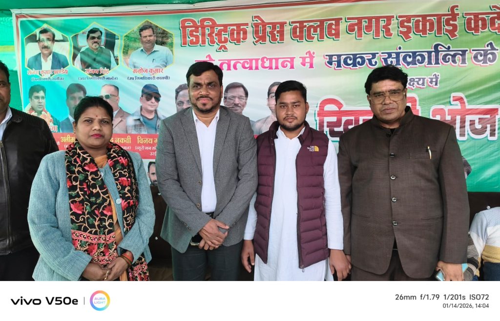 कदौरा/जालौन,कस्बे के मेला प्रांगण में मकर संक्रांति के पावन अवसर पर डिस्ट्रिक्ट प्रेस क्लब इकाई कदौरा एवं नगर पंचायत अध्यक्ष के नेतृत्व में सामाजिक समरसता और सेवा भाव का परिचय देते हुए विशाल खिचड़ी भोज एवं कंबल वितरण कार्यक्रम का आयोजन किया गया। इस अवसर पर हजारों लोगों ने खिचड़ी भोज का आनंद लिया, वहीं 200 जरूरतमंदों को कंबल वितरित किए गए। कंबल पाकर गरीबों के चेहरों पर खुशी साफ झलकती नजर आई।