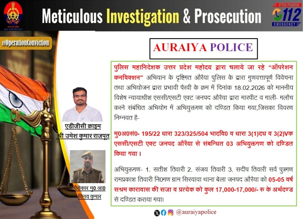औरैया –पुलिस महानिदेशक उत्तर प्रदेश महोदय द्वारा चलाये जा रहे “ऑपरेशन कनविक्शन” अभियान के दृष्टिगत औरैया पुलिस के द्वारा गुणवत्तापूर्ण विवेचना तथा अभियोजन द्वारा प्रभावी पैरवी के क्रम में दिनांक 18.02.2026 को माननीय विशेष न्यायाधीश एससी/एसटी एक्ट जनपद औरैया द्वारा मारपीट व गाली- गलौच करने संबंधित अभियोग में अभियुक्तगण को दण्डित किया गया,जिसका विवरण निम्नवत है-