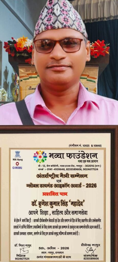 सोनभद्र। जिले के चोपन ब्लॉक अंतर्गत ग्राम पंचायत भरहरी के नवाचारी शिक्षक एवं साहित्यकार डॉ. बृजेश कुमार सिंह “महादेव” को भव्या फाउंडेशन के तत्वाधान में आयोजित अंतर्राष्ट्रीय मैत्री सम्मेलन में “ग्लोबल डायमंड आइकन अवार्ड–2026” से सम्मानित किया गया। यह भव्य समारोह जयपुर स्थित सुरेश ज्ञान विहार यूनिवर्सिटी के कालिंदी ऑडिटोरियम में 5 अप्रैल को आयोजित हुआ, जिसमें 15 देशों सहित लगभग 200 विशिष्ट प्रतिभाओं को सम्मानित किया गया।