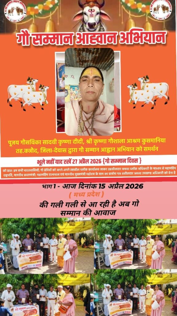 श्री कृष्णा गौशाला आश्रम कुसमानिया मैं पधारे और वहां से हम सब लोग बड़ी संख्या में तहसील कार्यालय कन्नौद पहुंच कर गौसम्मान अभियान का निवेदन पत्र श्रीमान तहसीलदार महोदय कन्नौद को ठीक 11:00 प्रस्तुत करेंगे