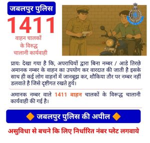 जबलपुर पुलिस अमानक नम्बर वाले 1411 वाहन चालकों के विरूद्ध चालानी कार्यवाही करते हुये 7 लाख 5 हजार 500 रूपये वसूला गया समन शुल्क, June 5, 2025