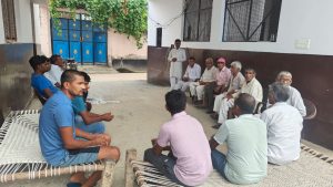ग्राम नगलिया मुंशी में राष्ट्र सेवी संगठन के कार्यकर्ताओं की बैठक में बोलते संयोजक कृष्ण कुमार शर्मा। July 20, 2025